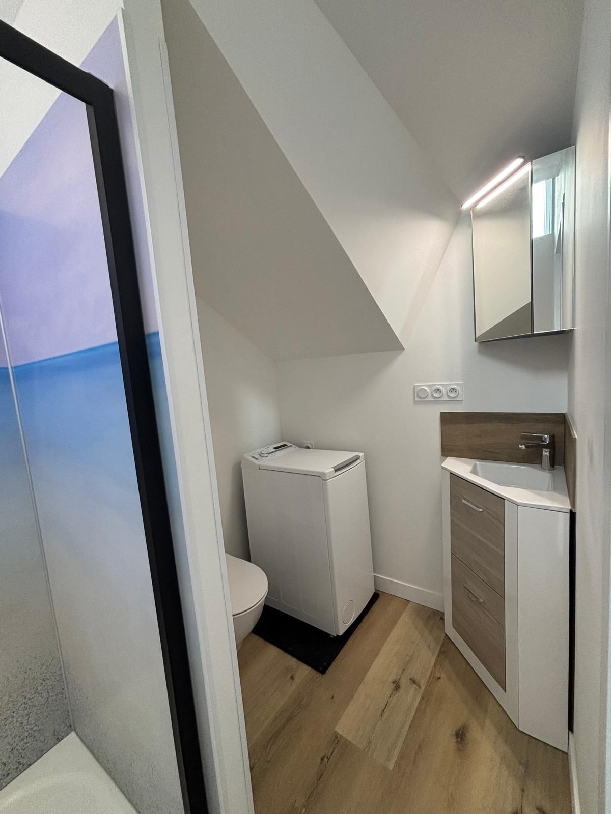 • Une salle d’eau moderne avec douche, lavabo et WC