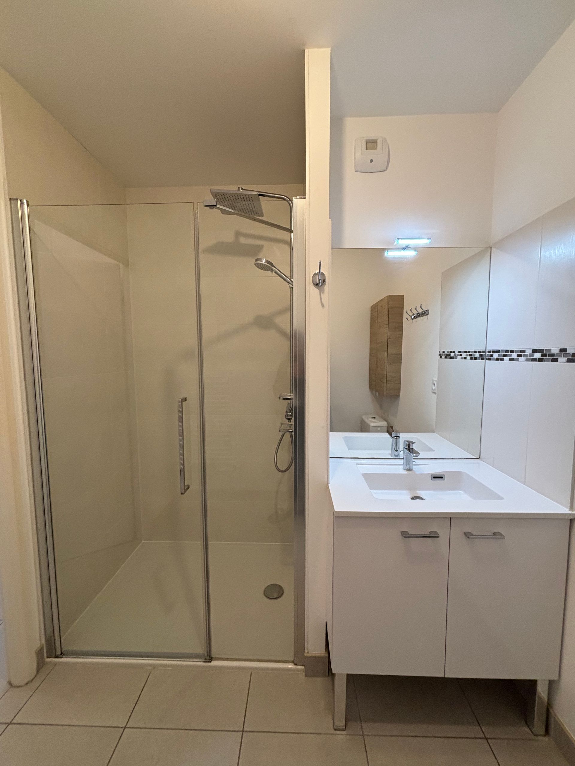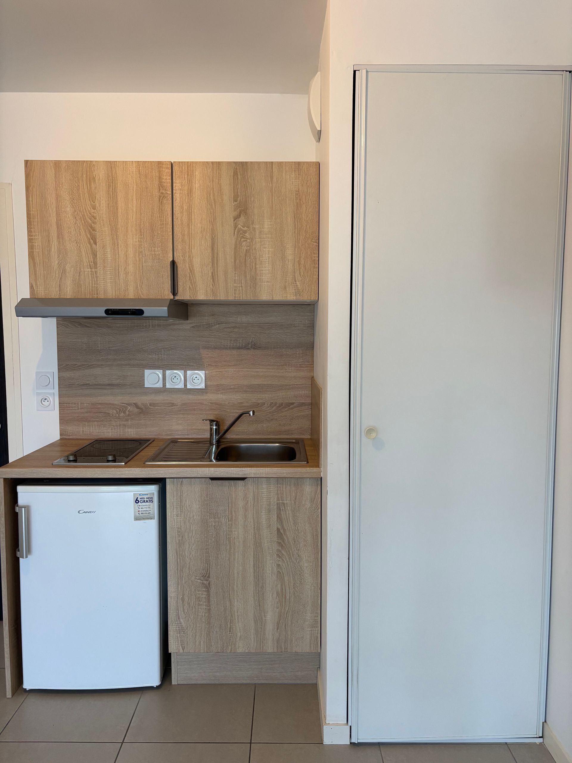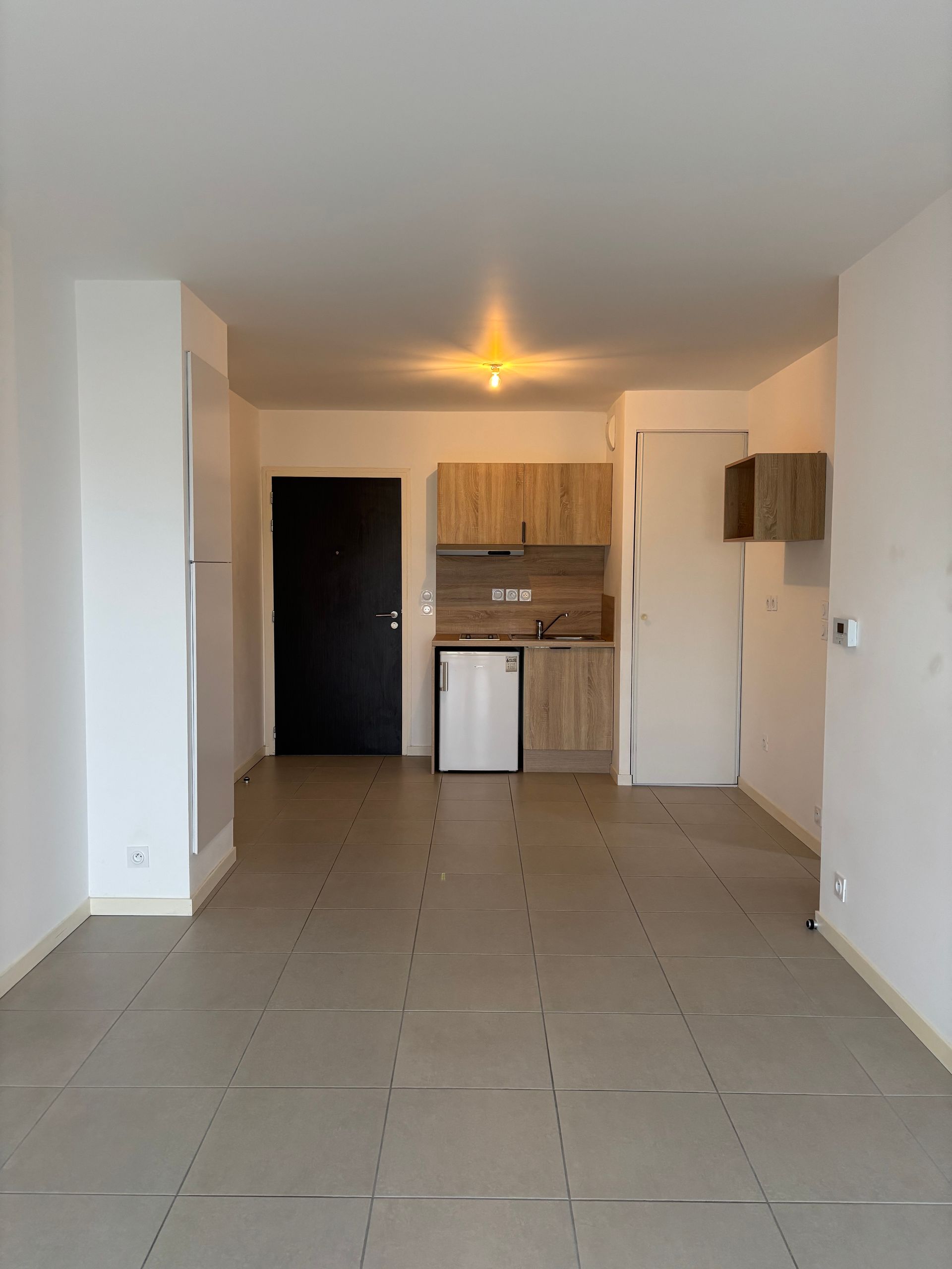 L’appartement comprend une pièce de vie lumineuse avec cuisine aménagée et équipée (plaques, hotte, réfrigérateur), une chambre, un dégagement avec placard, une salle d’eau avec WC, ainsi qu’une terrasse privative de 6,57 m².